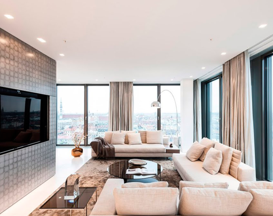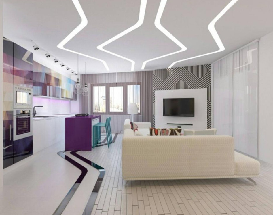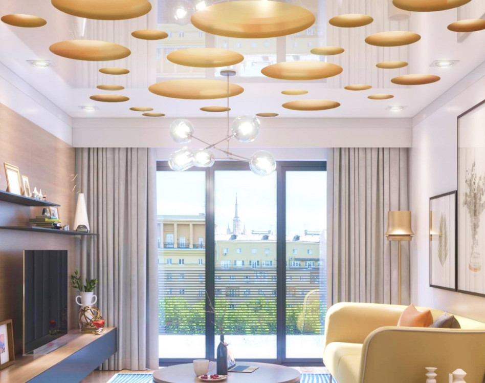 Заказать натяжные потолки уместно для гостиной – они визуально расширят помещение. Такие конструкции удачно смотрятся в классическом и современном интерьере.